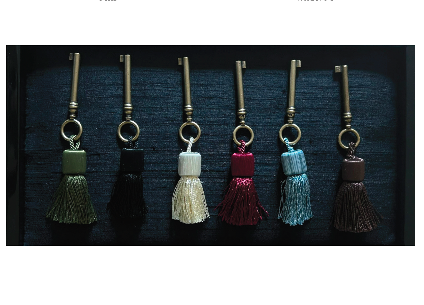 Materials: Oak, Glass, Brass key and tassel, Faux Suede, Lacquer