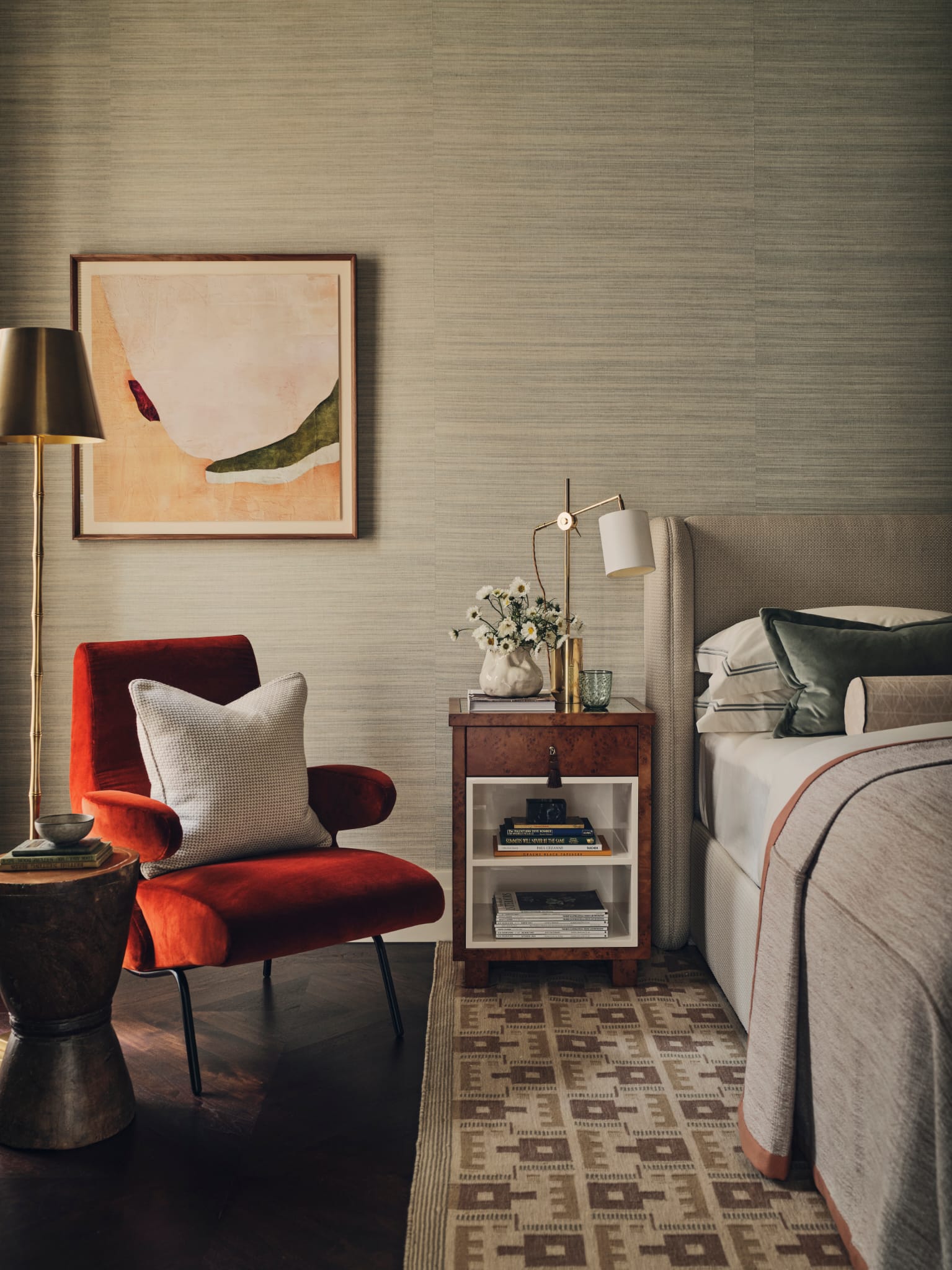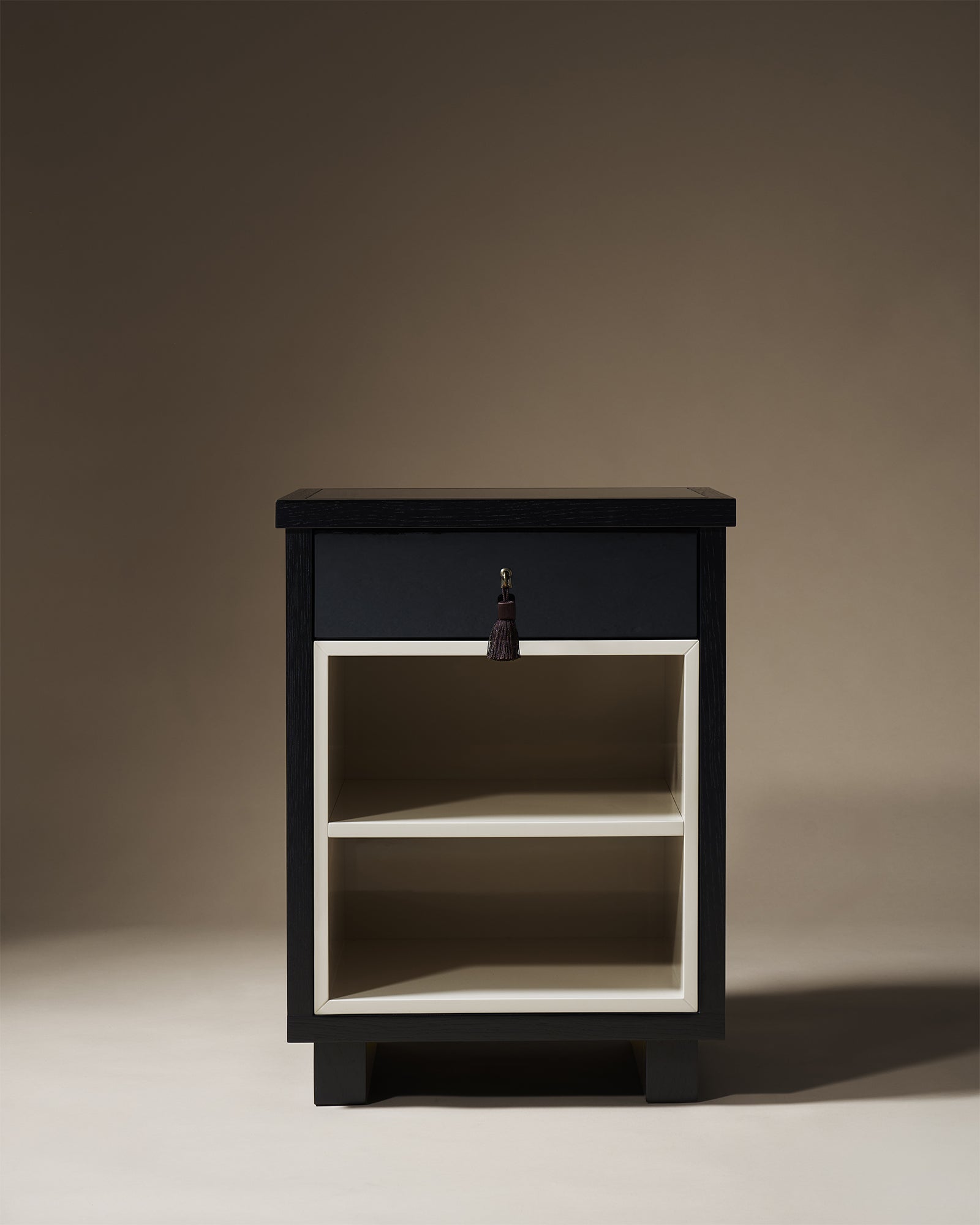 Evoking the spirit of Art Deco through a contemporary lens, the Lauren Bedside Table by Astrid Houssin combines timeless form with refined detail. Crafted in oak and lacquer, this piece features a lockable drawer, open shelving, and an antique brass key adorned with a tassel. The drawer is lined in faux suede, adding a subtle tactile contrast.