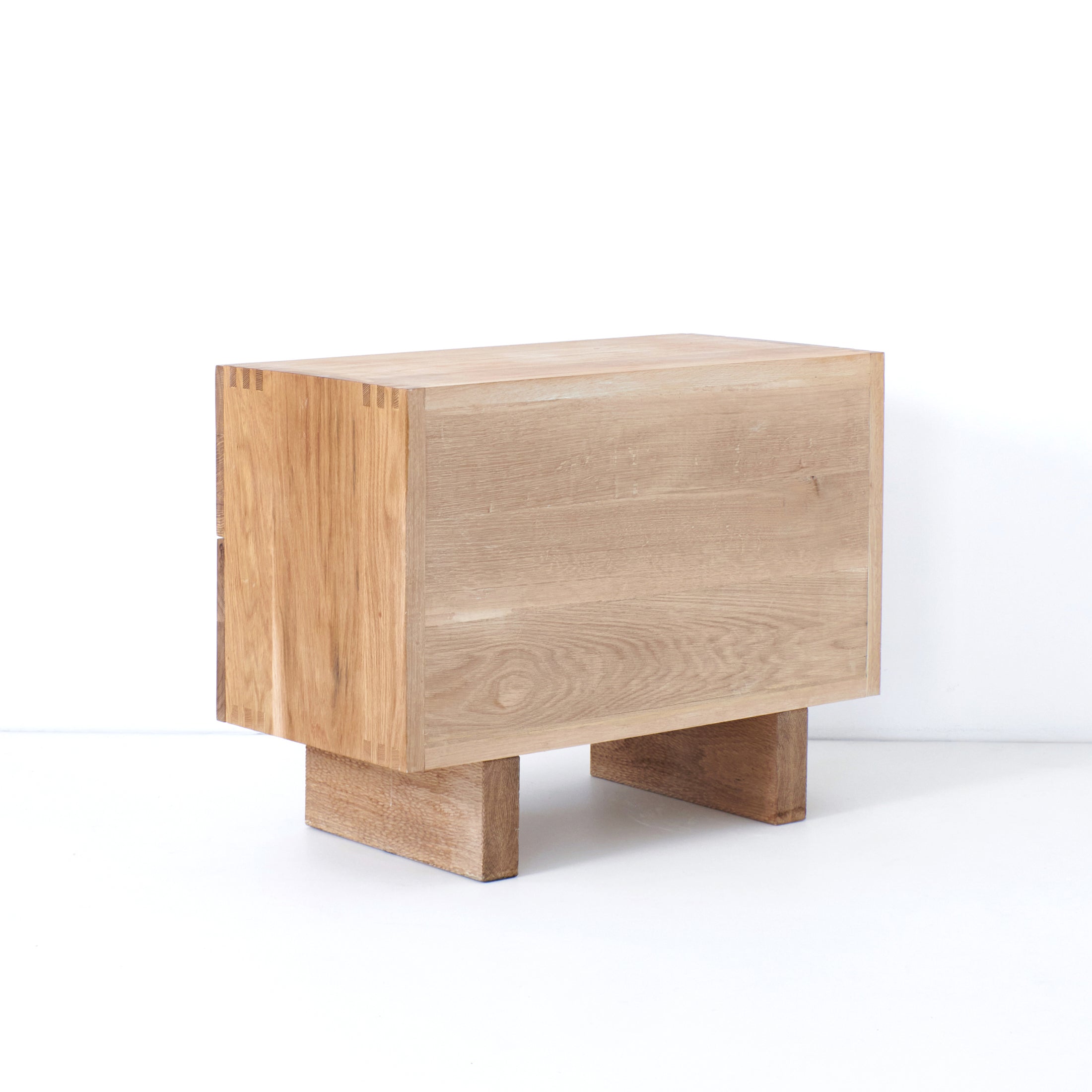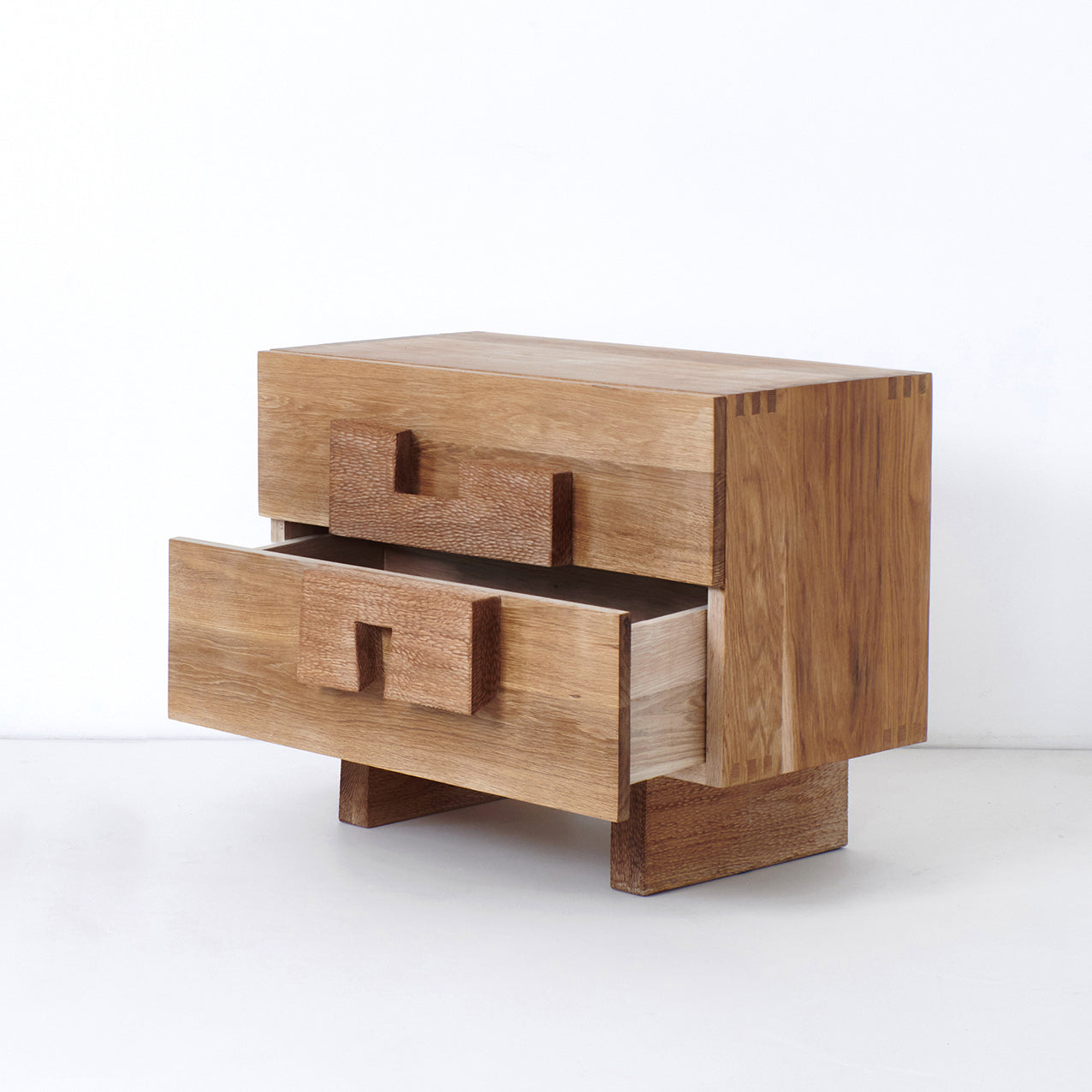 Handmade in solid oak, the Douro bed side table features two drawers. It is adorned with handles and legs decorated with a hand carved texture. With its geometrical playful handles, and sophisticated finishings, this is the perfect addition to any bedroom.