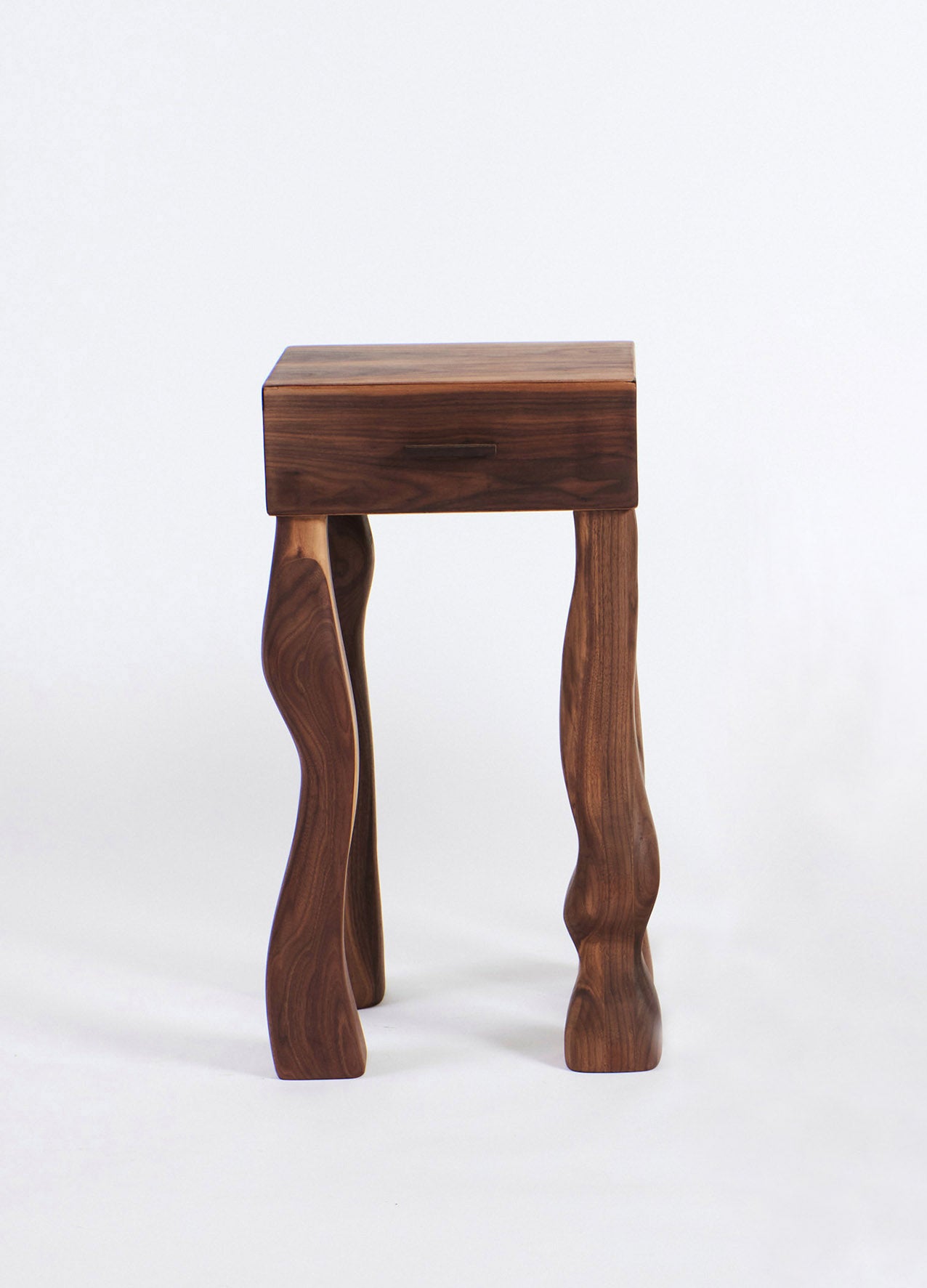 Handmade in solid walnut, in Portugal, this Side Table with Drawer is the perfect addition to any room. Versatile, it can be used as bed side table as well as an entrance or living room side table. Its wiggly feet adds a playful and visual touch to an otherwise elegant and sophisticated design.