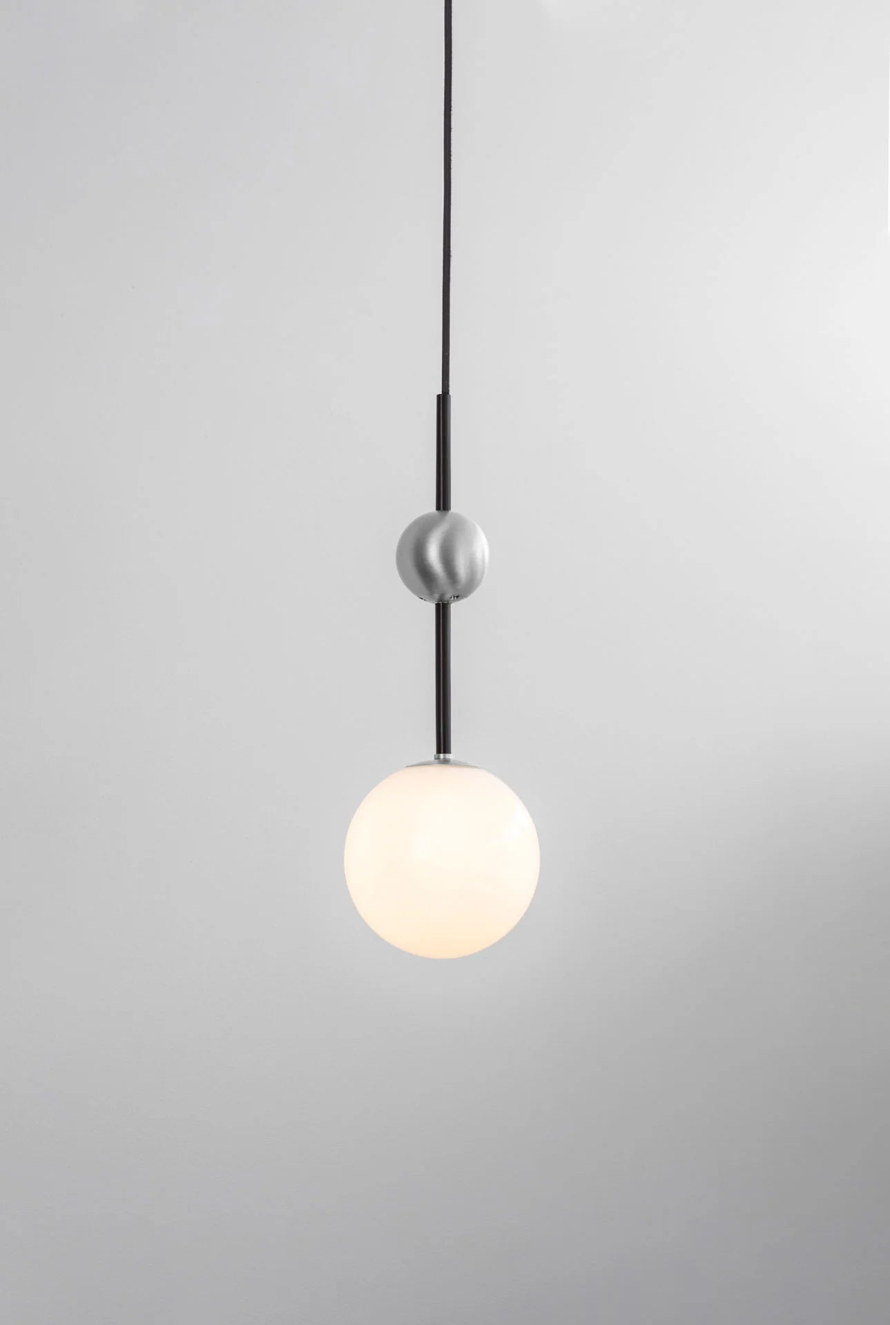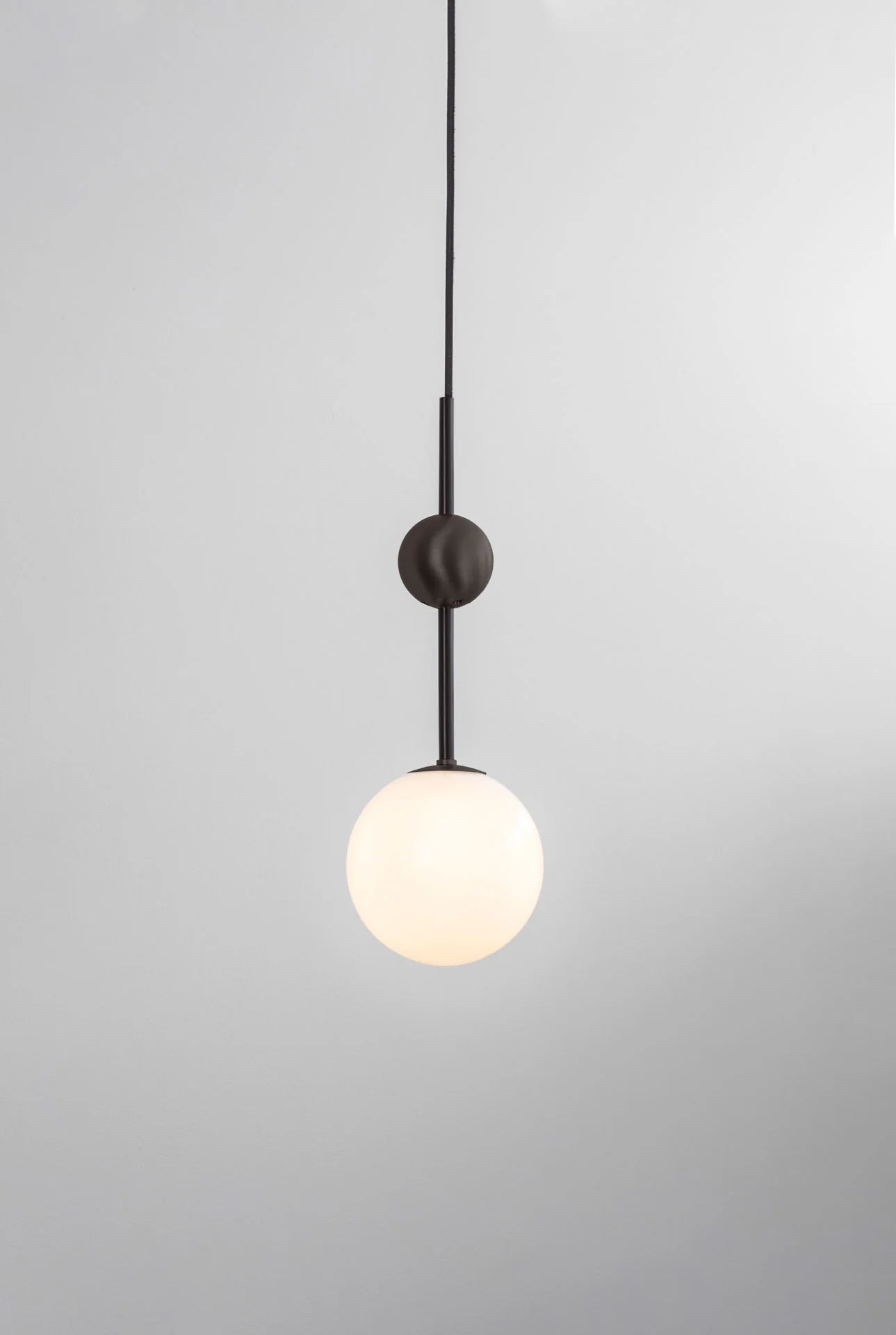 The Rift pendant light by Bert Frank is all about classic proportions and the intriguing juxtaposition between the earthiness of heavy metal and the luminosity of glass. A clean and crisp design – essentially, one small brass sphere positioned above a larger opal glass globe – that plays with form and balance.