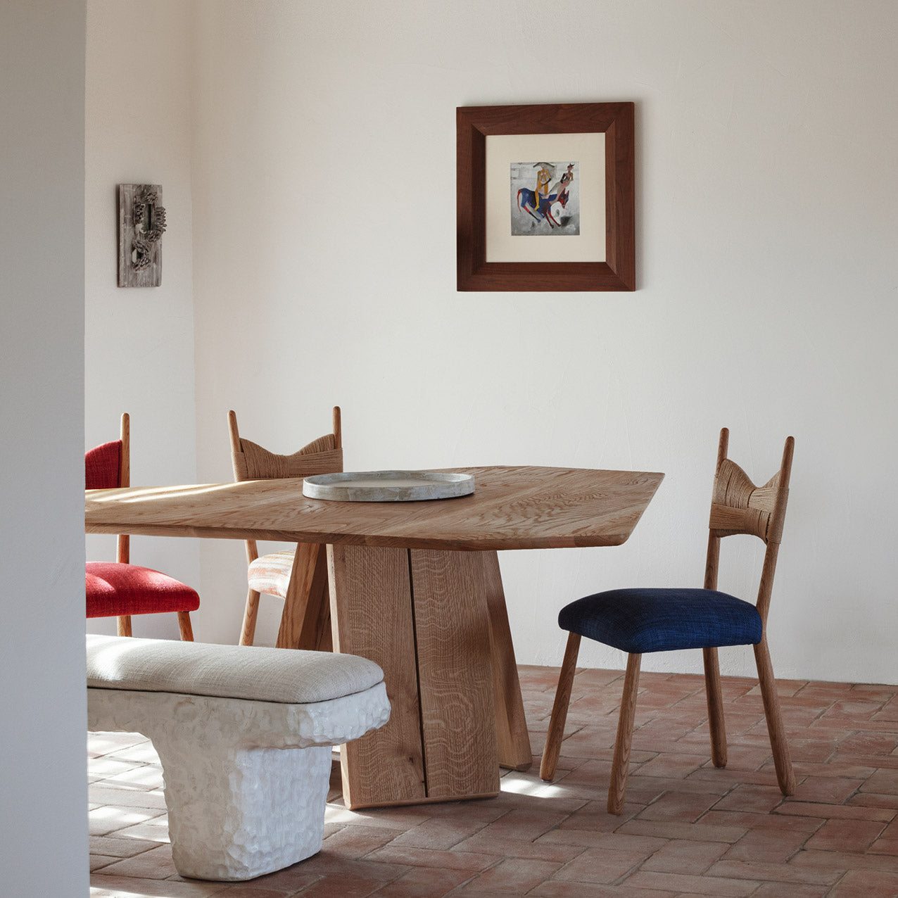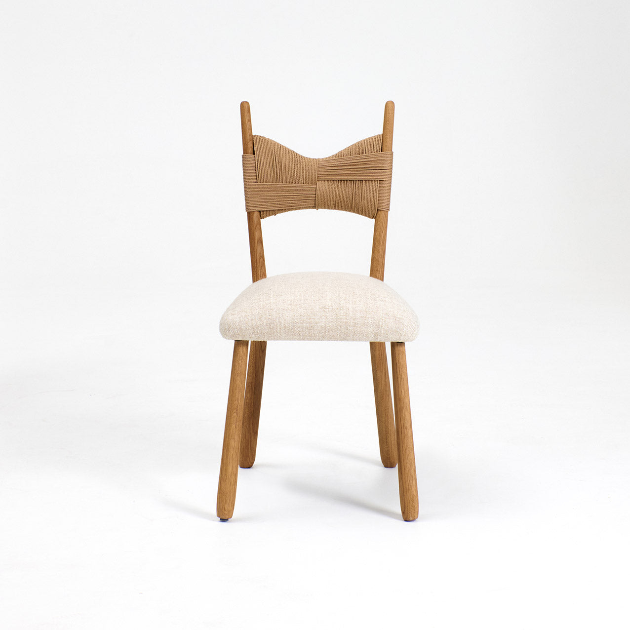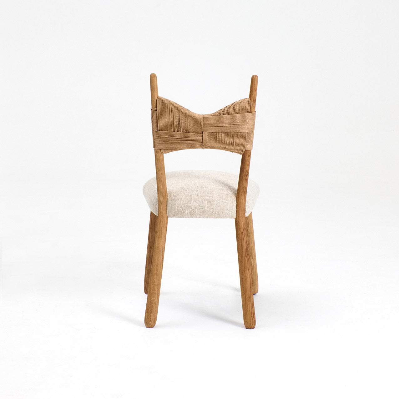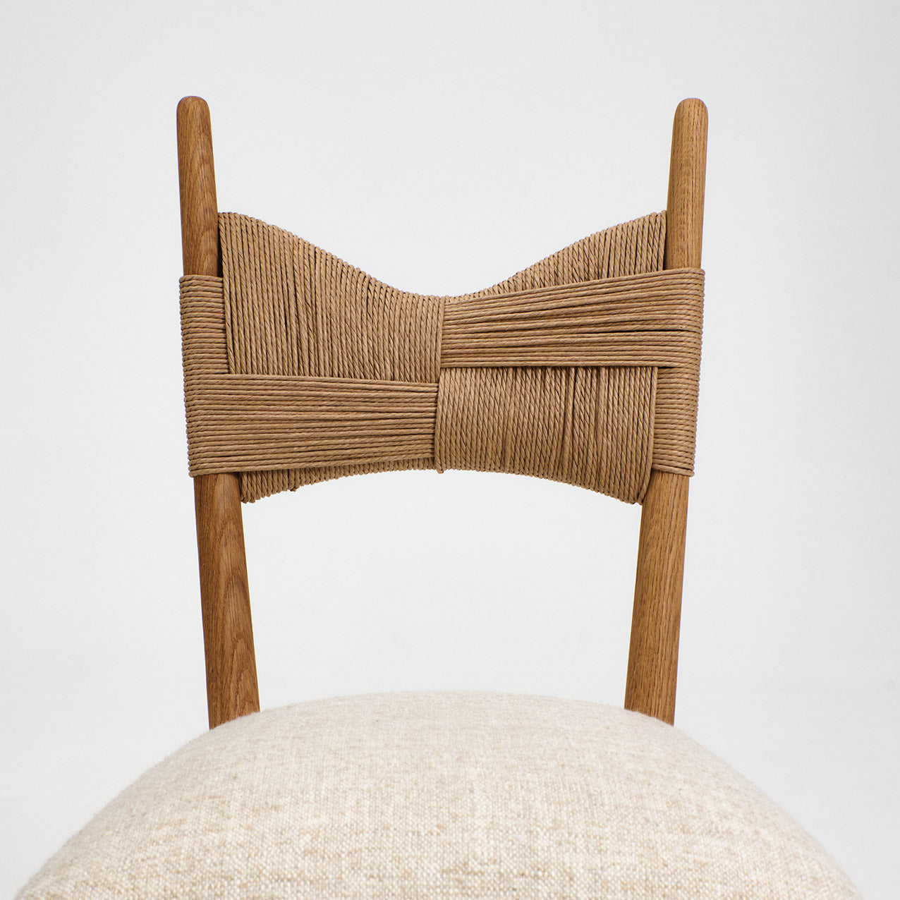 Timeless and inviting, the Pericia chair features an organically shaped backrest embellished with weaved papercord and a plush upholstered seat for superior comfort. Its soft curves and sleek profile bring warmth and elegance to any dining or living space.