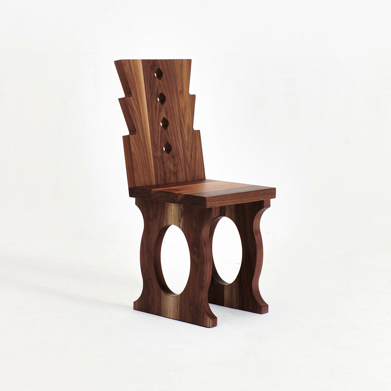 This chair is part of a series of eight distinctive designs, each defined by a sculptural, geometric backrest and elegantly structured legs. Handcrafted from solid walnut by artisans in Northern Portugal, the collection reimagines traditional woodworking with striking originality and architectural poise.