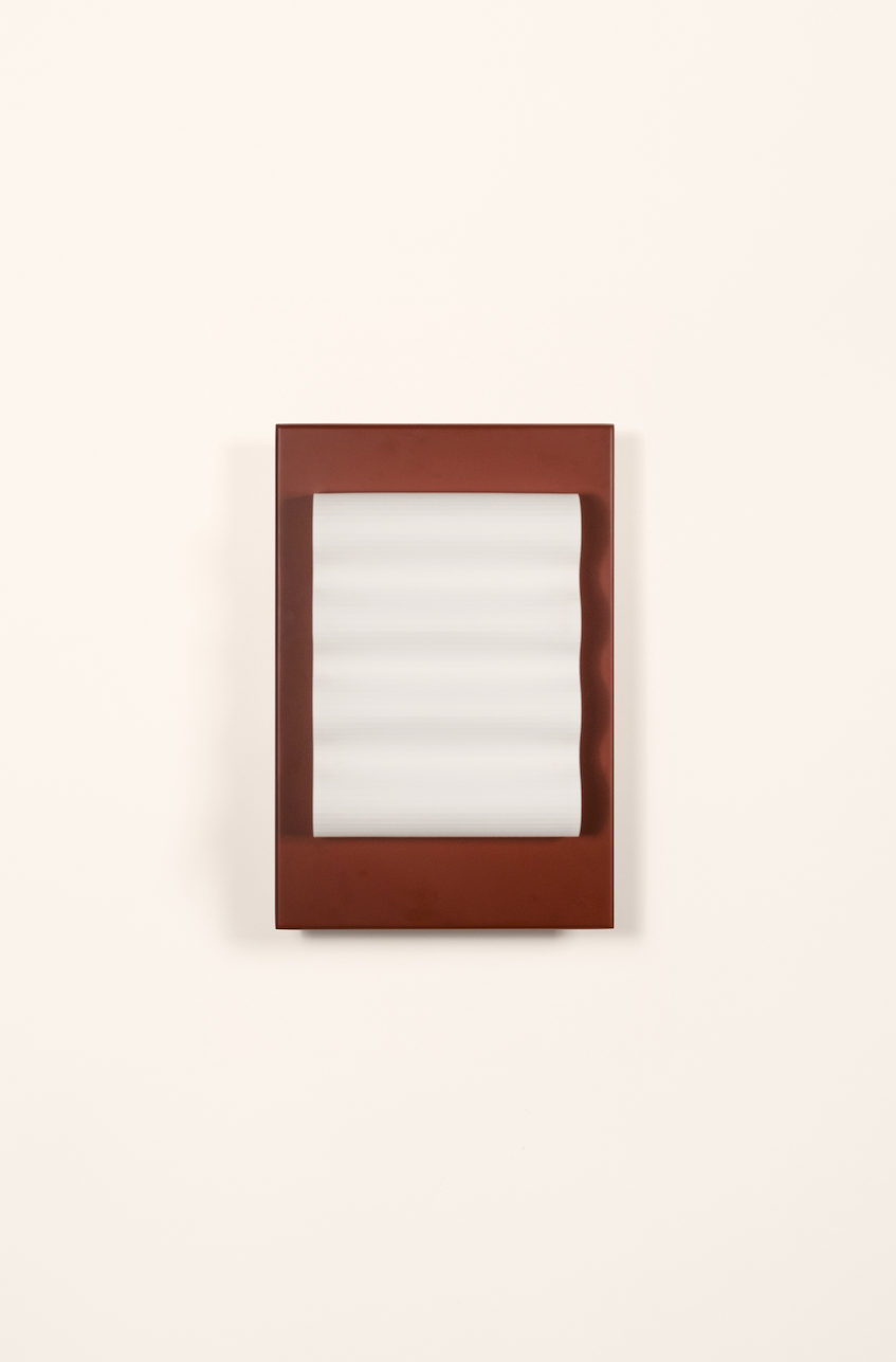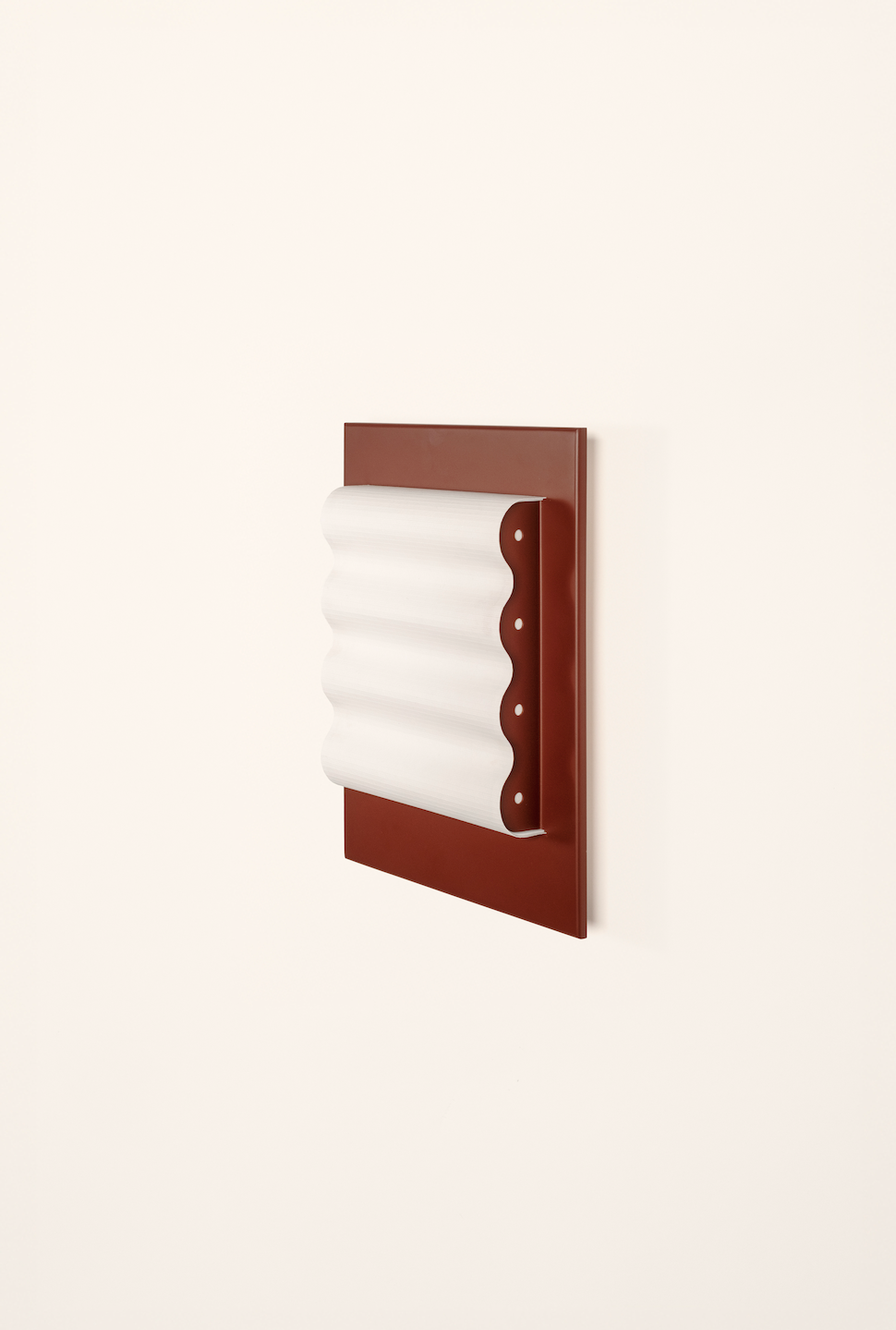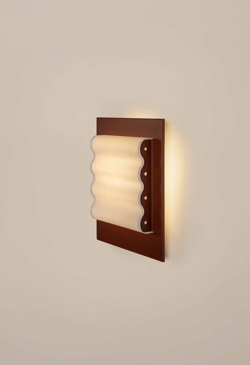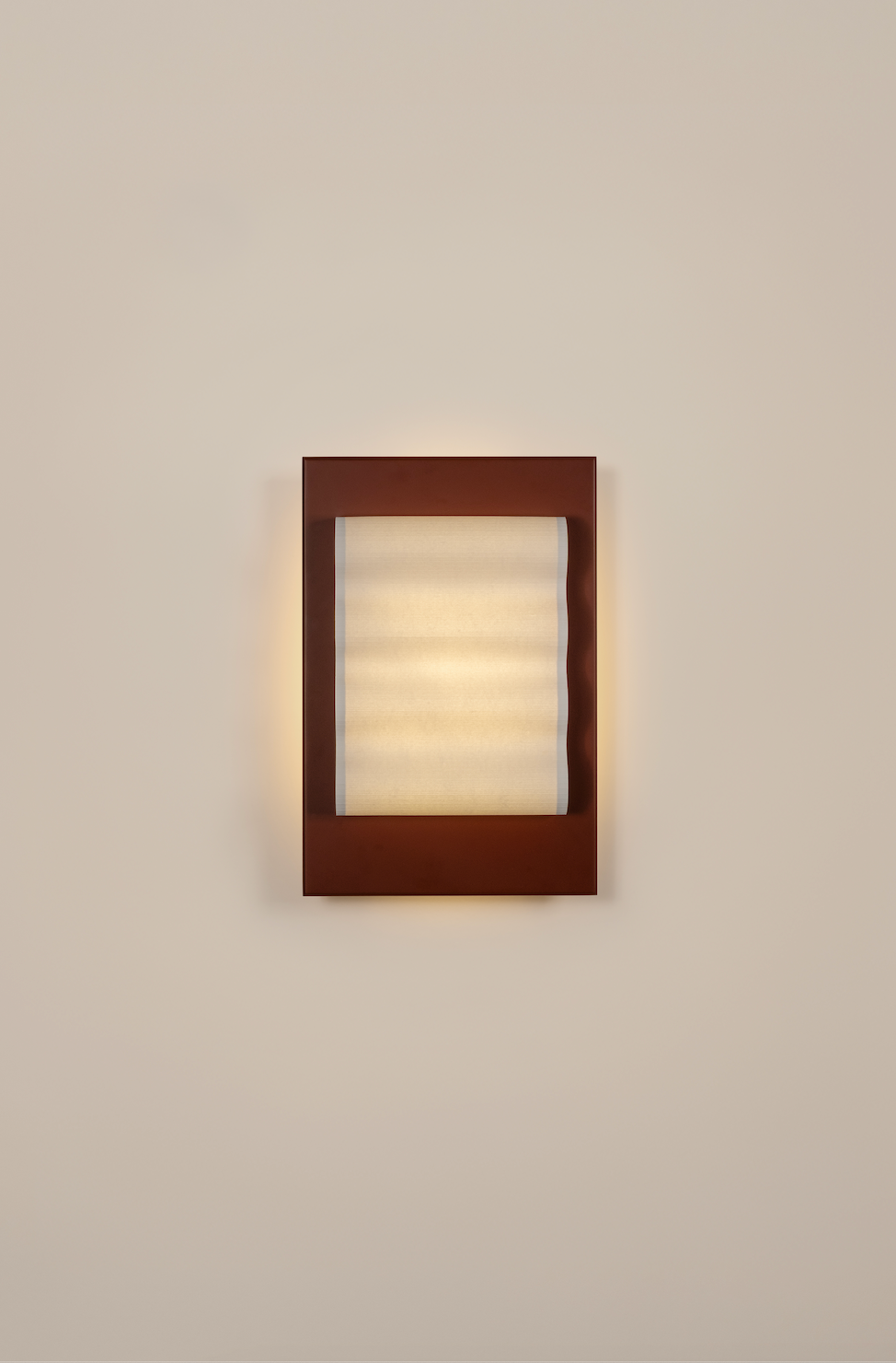 Designed by Violaine d'Harcourt, the Frame wall light is a subtle nod to modern architecture. Made in Portugal, this sleek wall light is composed of a lacquered reddish brown aluminium base and undulating textured paper that softly diffuses the light. Available in three sizes.