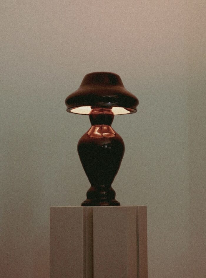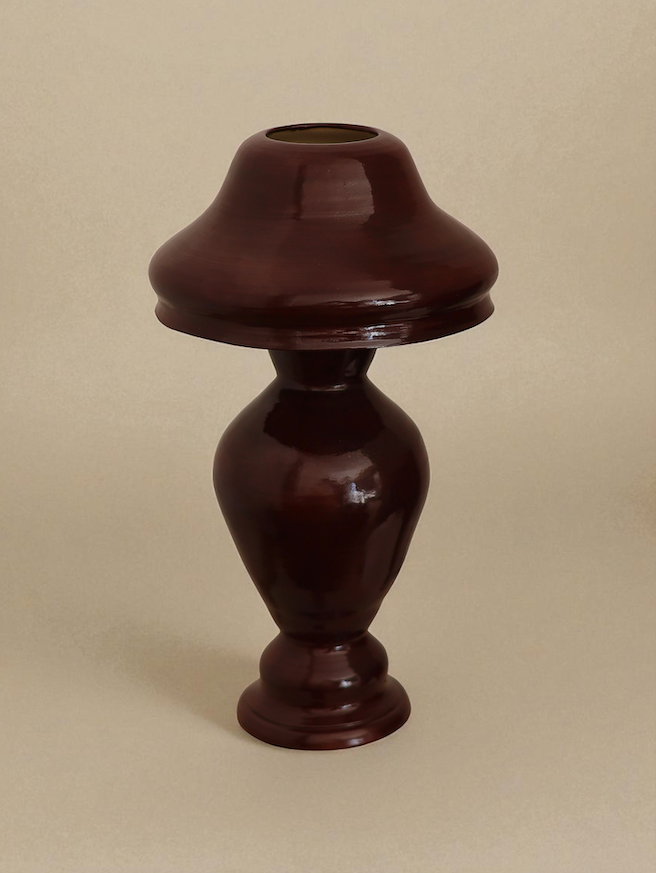 Grenat Foncé II est une lampe de table sculpturale en émail cordovan grenat foncé, une couleur riche et profonde. Sa silhouette équilibre une base audacieuse et organique avec un large abat-jour en céramique en forme de champignon, créant une interaction harmonieuse de volume et de proportion. La surface riche et brillante rehausse la profondeur de la couleur, ce qui en fait à la fois un objet fonctionnel et une pièce maîtresse.