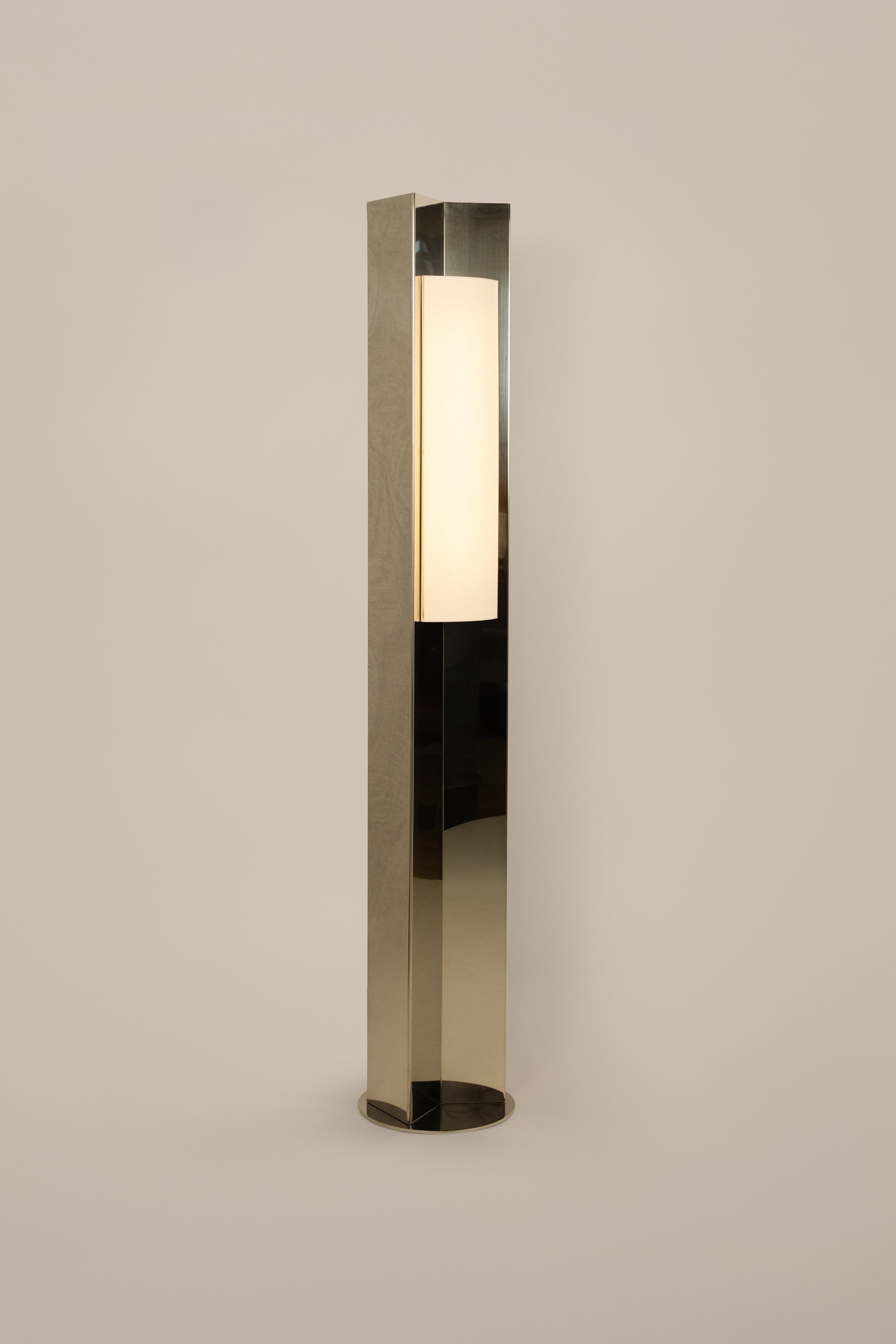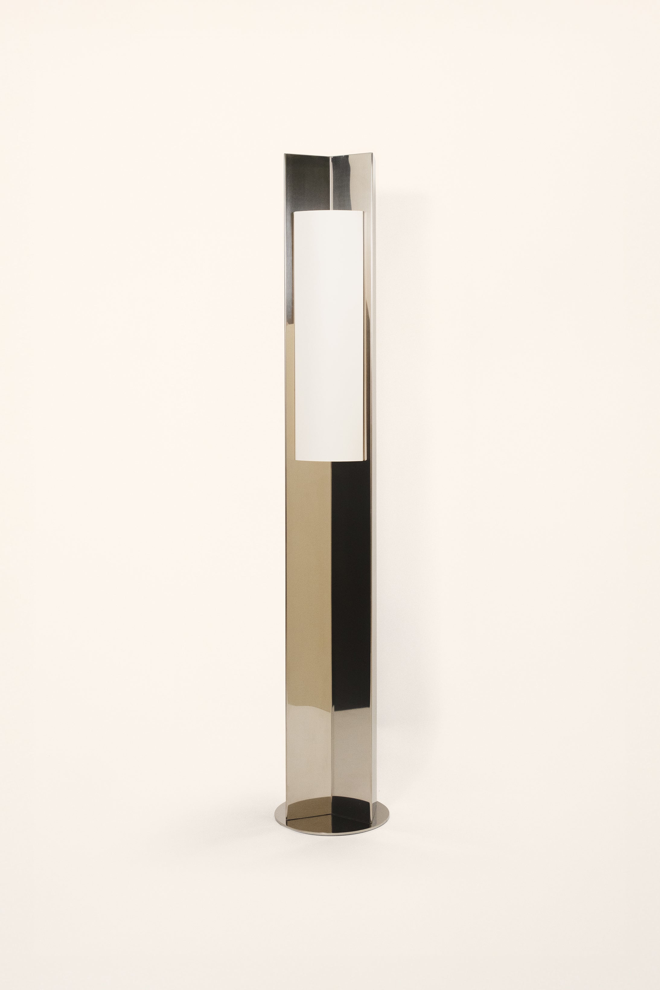 With its bold, geometric silhouette, the Arrow Floor Lamp by French designer Violaine d’Harcourt makes a striking statement in any space. Standing at 158 cm, this minimalist piece is crafted from polished stainless steel, its reflective surface subtly interacting with the surrounding space, shifting with light and movement throughout the day. The Arrow Floor Lamp is available with or without a handcrafted paper diffuser, carefully made in d’Harcourt’s Lisbon-based atelier. The diffuser gently softens the light, creating a warm and atmospheric glow, while the bare metal version delivers a more direct, architectural illumination.