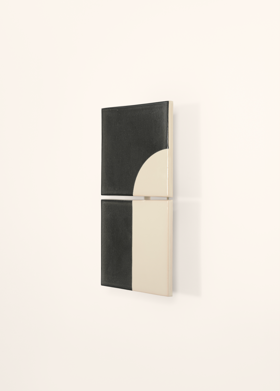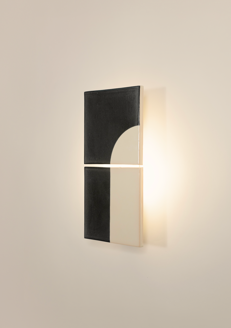 The Door wall light is part of the Tiles collection, a series of ceramic lights by Violaine d'Harcourt in collaboration with Dutch designer Marianne Smink. Handcrafted in a workshop north of Coimbra, Portugal, each tile is screen-printed in natural tones. The indirect lighting provides a soft, warm glow. Each Door wall light features slight colour variations and imperfections that highlight the beauty of craftsmanship.