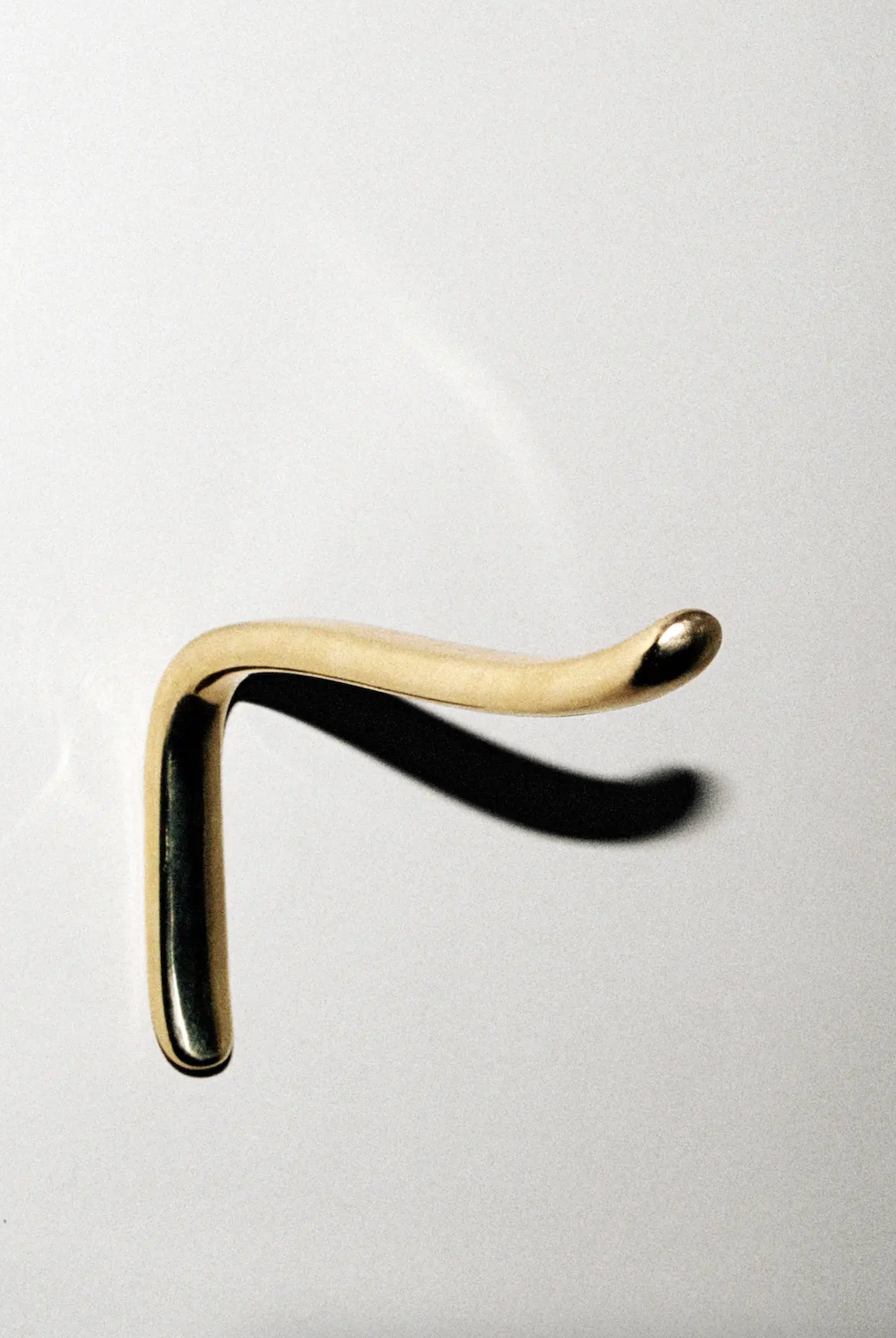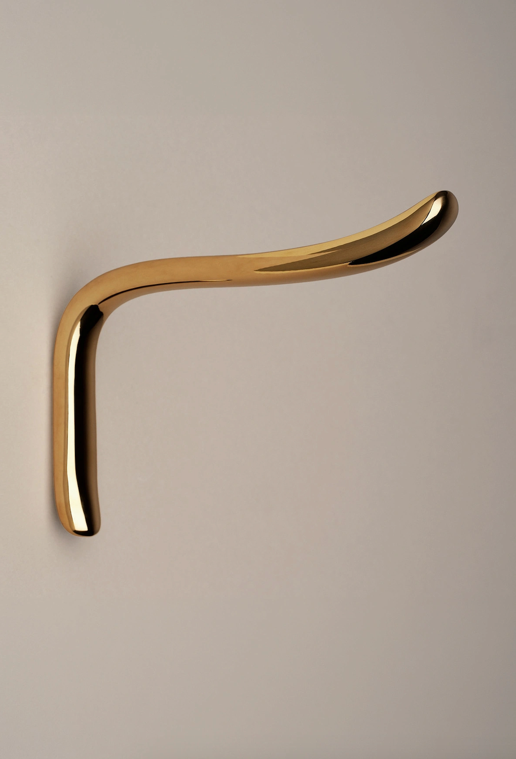 A larger wall hook defined by a clear, elongated curve. Its horizontal form creates a generous resting point, intended to hold hangers with ease. With concealed mounting and no visible hardware, it sits seamlessly against the wall, reading as a sculptural object as much as a functional detail. Repeated along a wall, it creates a calm rhythm and sense of structure, pairing effortlessly with our hooks Iris and Noor. The collection is made exclusively from recycled solid brass, in a second-generation foundry in Florence, Italy.