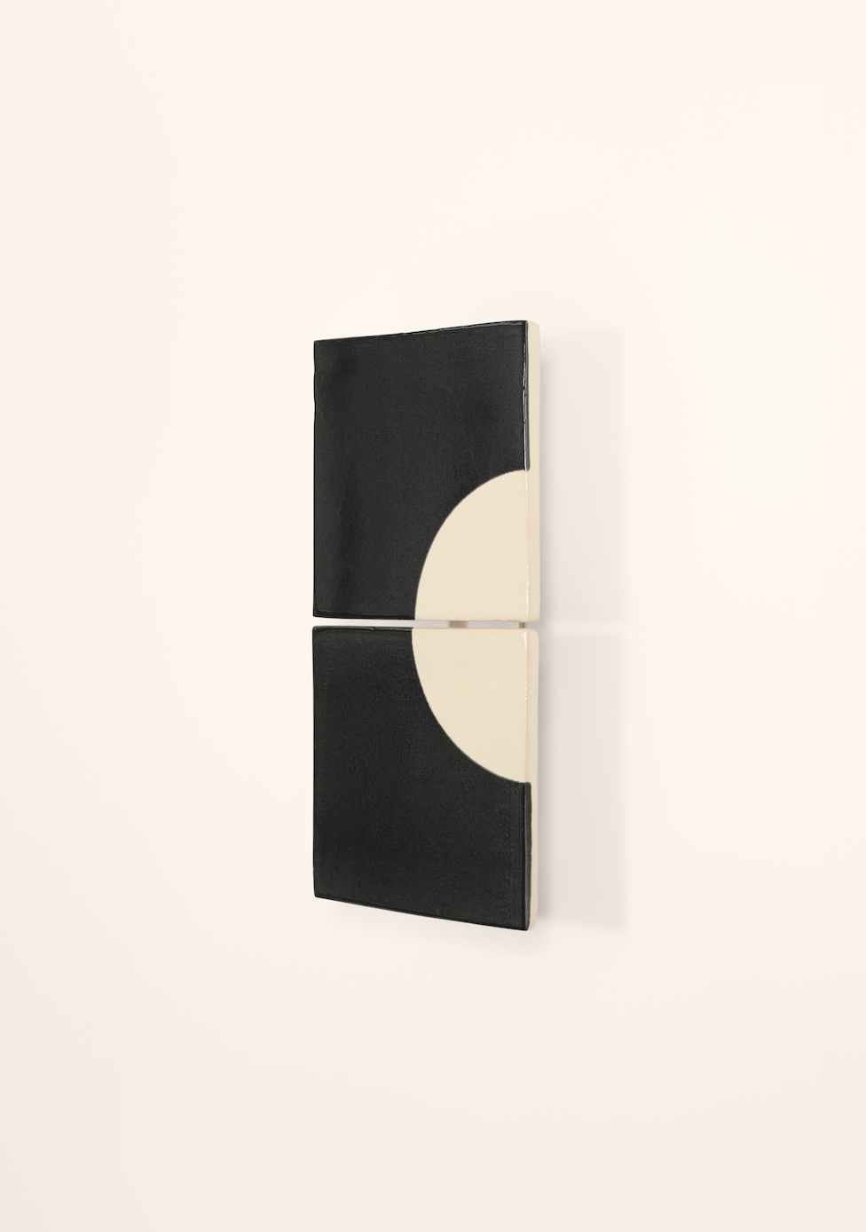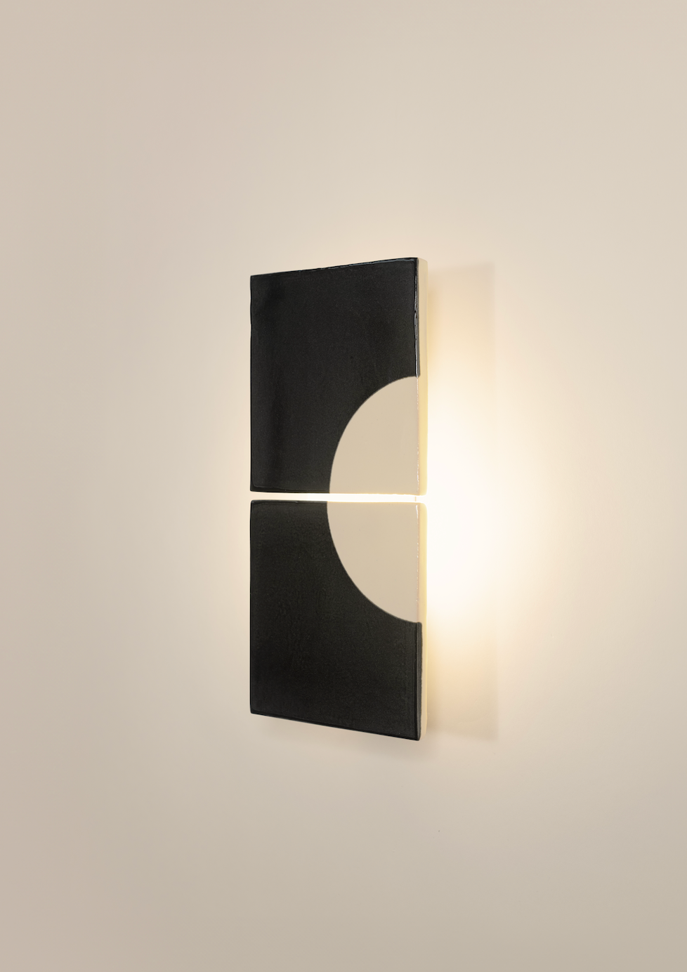 The Moon wall light is part of the Tiles collection, a series of ceramic lights by Violaine d'Harcourt in collaboration with Dutch designer Marianne Smink. Handcrafted in a workshop north of Coimbra, Portugal, each tile is screen-printed in natural tones. The indirect lighting provides a soft, warm glow. Each Moon wall light is unique, featuring slight colour variations that highlight the beauty of craftsmanship.