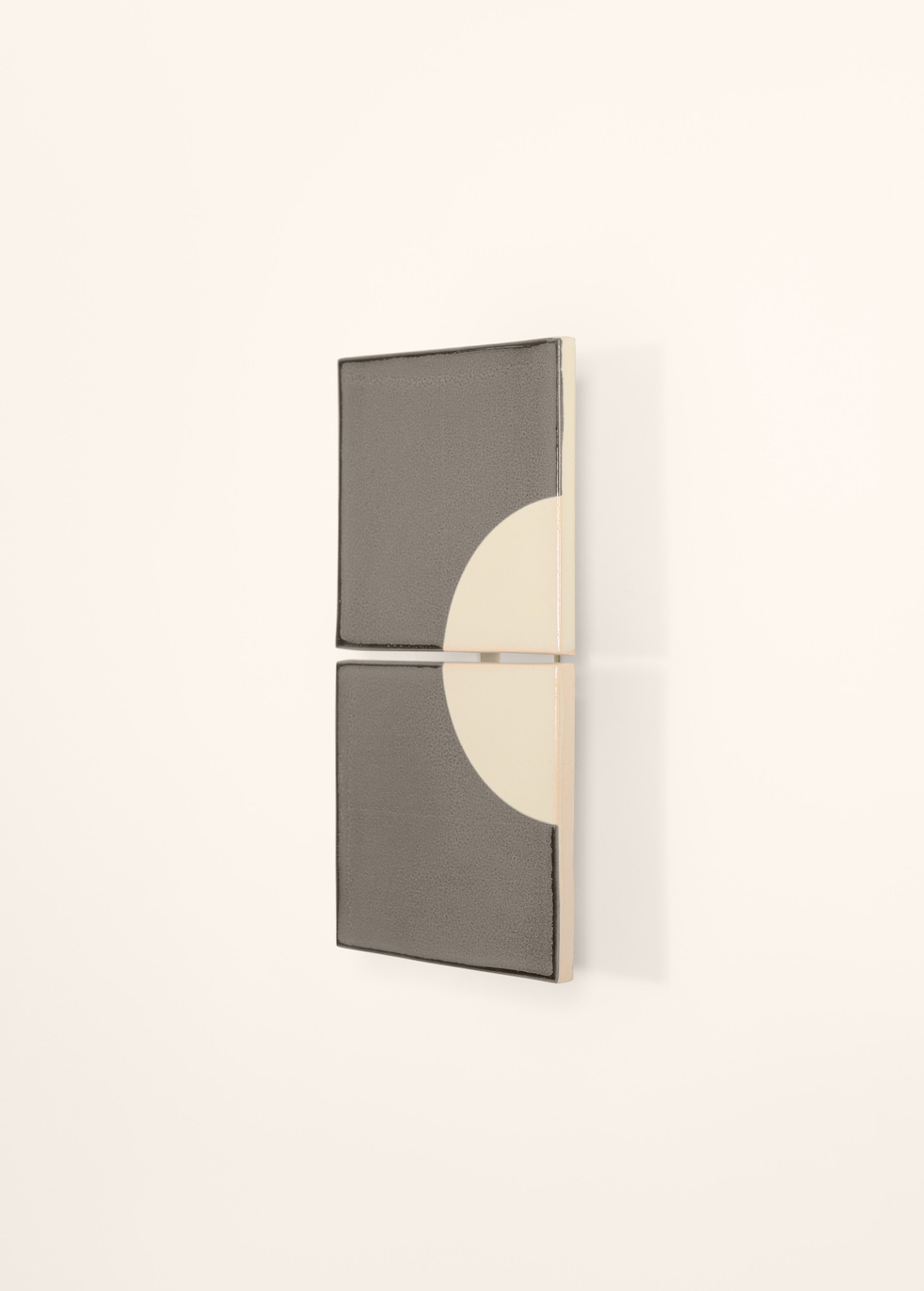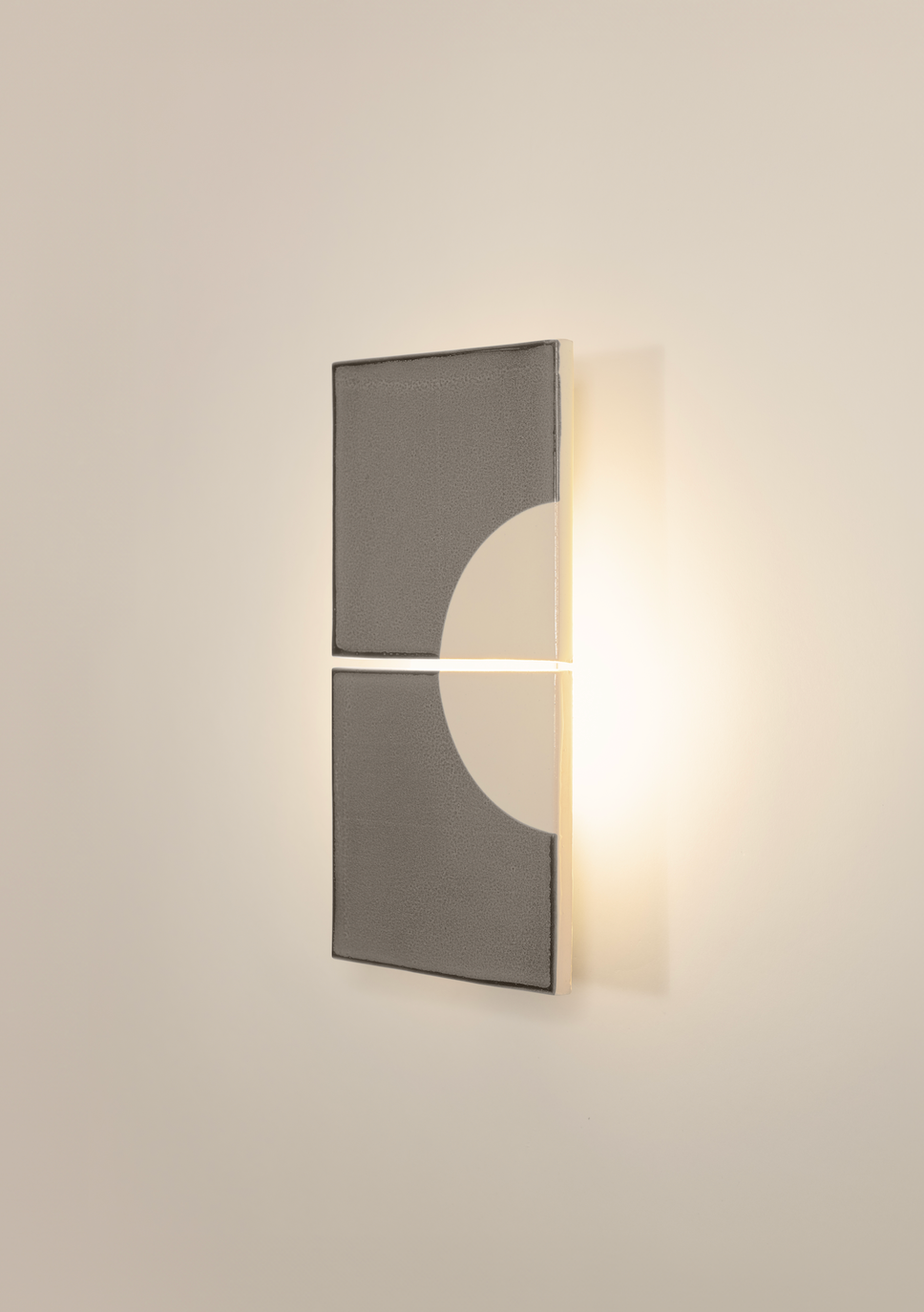 The Moon wall light is part of the Tiles collection, a series of ceramic lights by Violaine d'Harcourt in collaboration with Dutch designer Marianne Smink. Handcrafted in a workshop north of Coimbra, Portugal, each tile is screen-printed in natural tones. The indirect lighting provides a soft, warm glow. Each Moon wall light is unique, featuring slight colour variations that highlight the beauty of craftsmanship.